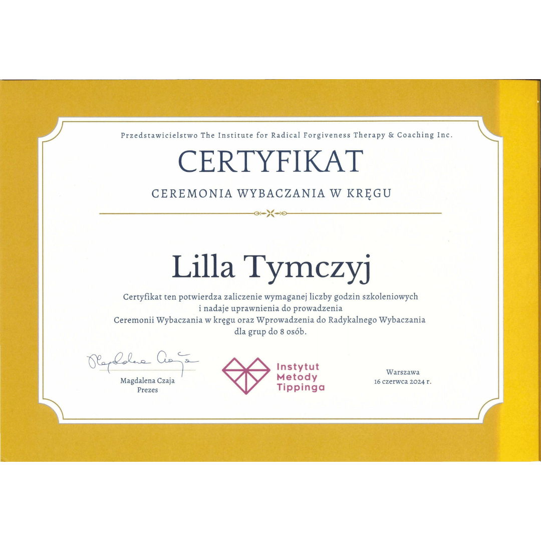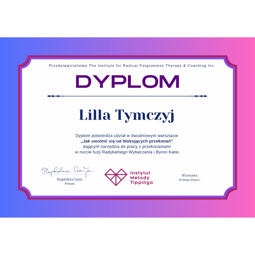 Jako certyfikowany trener Radykalnego Wybaczania w Instytucie Metody Teppinga oraz specjalistka w psychologii pozytywnej i psychologii biznesu, wiem, że uważne słuchanie i przemyślane pytania mogą zmieniać perspektywę oraz pomagać w odnajdywaniu celu. Lubię prowadzić rozmowy, które prowadzą do odkrywania odpowiedzi w nas samych.