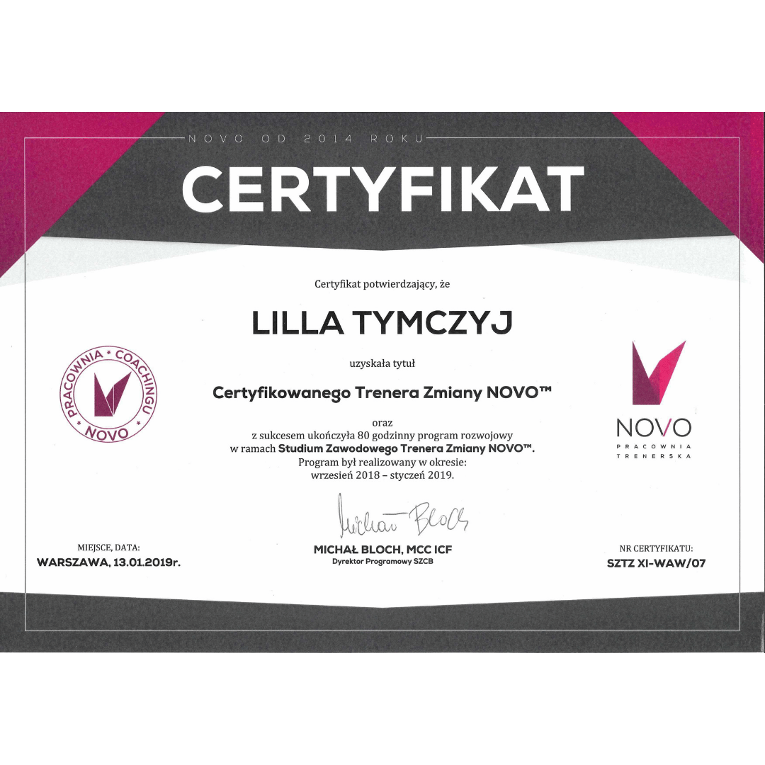 Dzięki jej profesjonalnemu podejściu zaczęłam dostrzegać nowe perspektywy i zyskałam wsparcie, którego tak bardzo potrzebowałam. Ufam jej i wiem, że pomoże mi w dalszej drodze. Z całego serca polecam Lillę – to wspaniała kobieta i ekspert w tym, co robi!”