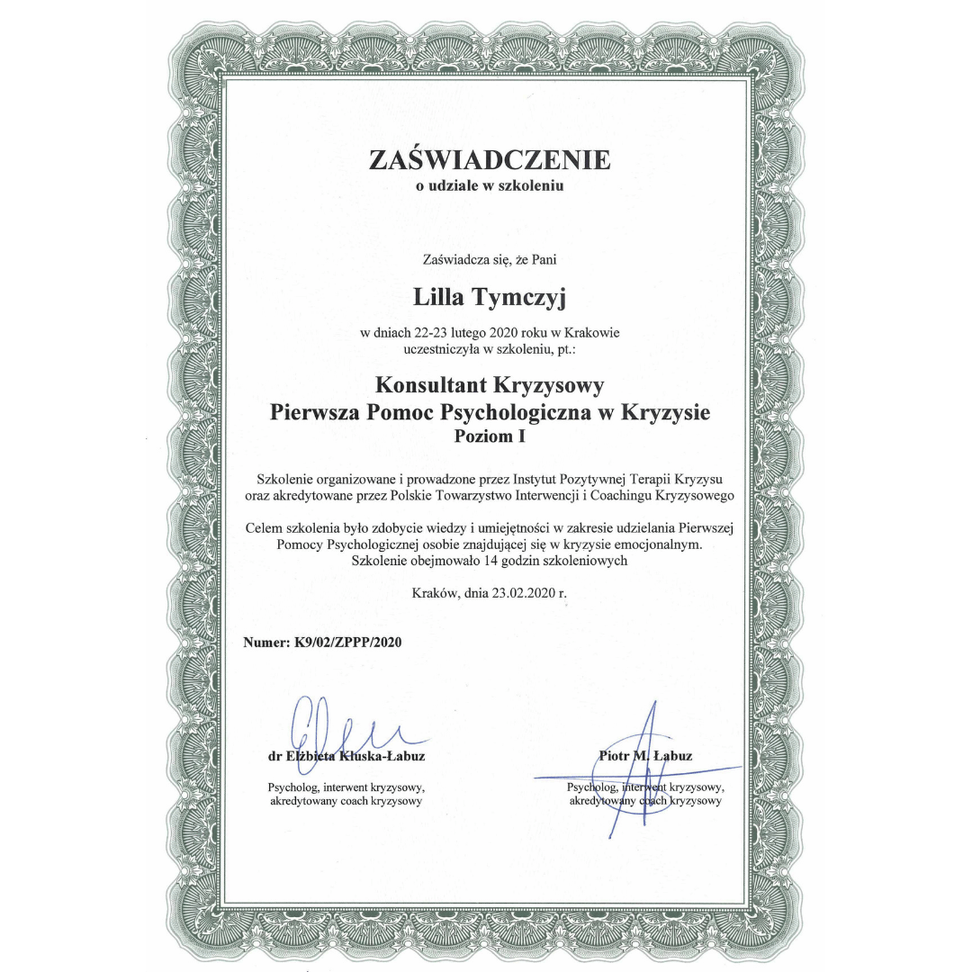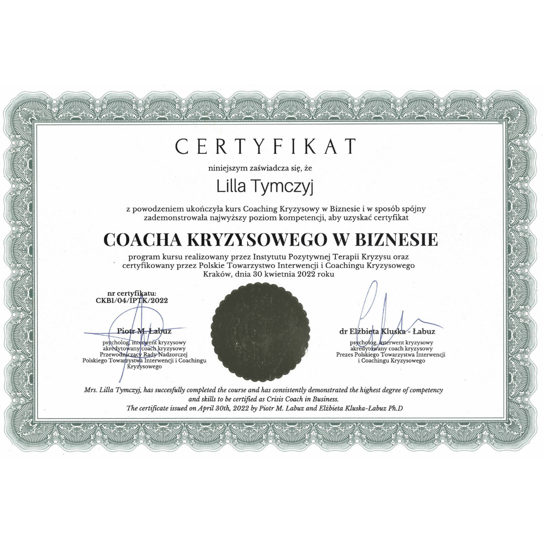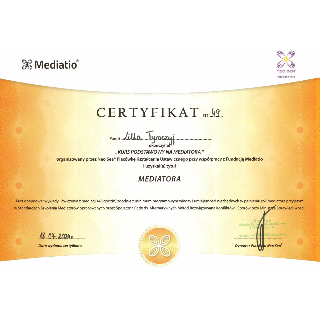 Od ponad 10 lat zajmuję się rozwojem osobistym, co pozwala mi skutecznie wspierać innych w ich drodze do samopoznania. Pracując z osobami w trudnych sytuacjach, wykorzystuję umiejętności konsultanta kryzysowego oraz coacha/mentora kryzysowego z Akademii IPTK. Łączę coaching z mediacją, co umożliwia mi skuteczne wspieranie klientów w rozwiązywaniu konfliktów i dostosowywaniu podejścia do ich potrzeb.